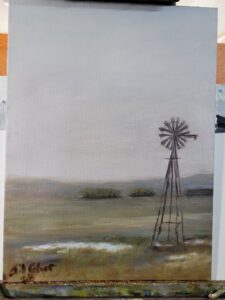 Nebraska Windmill by Jil Culver, 2024, Oil on 9″x12″ canvas board