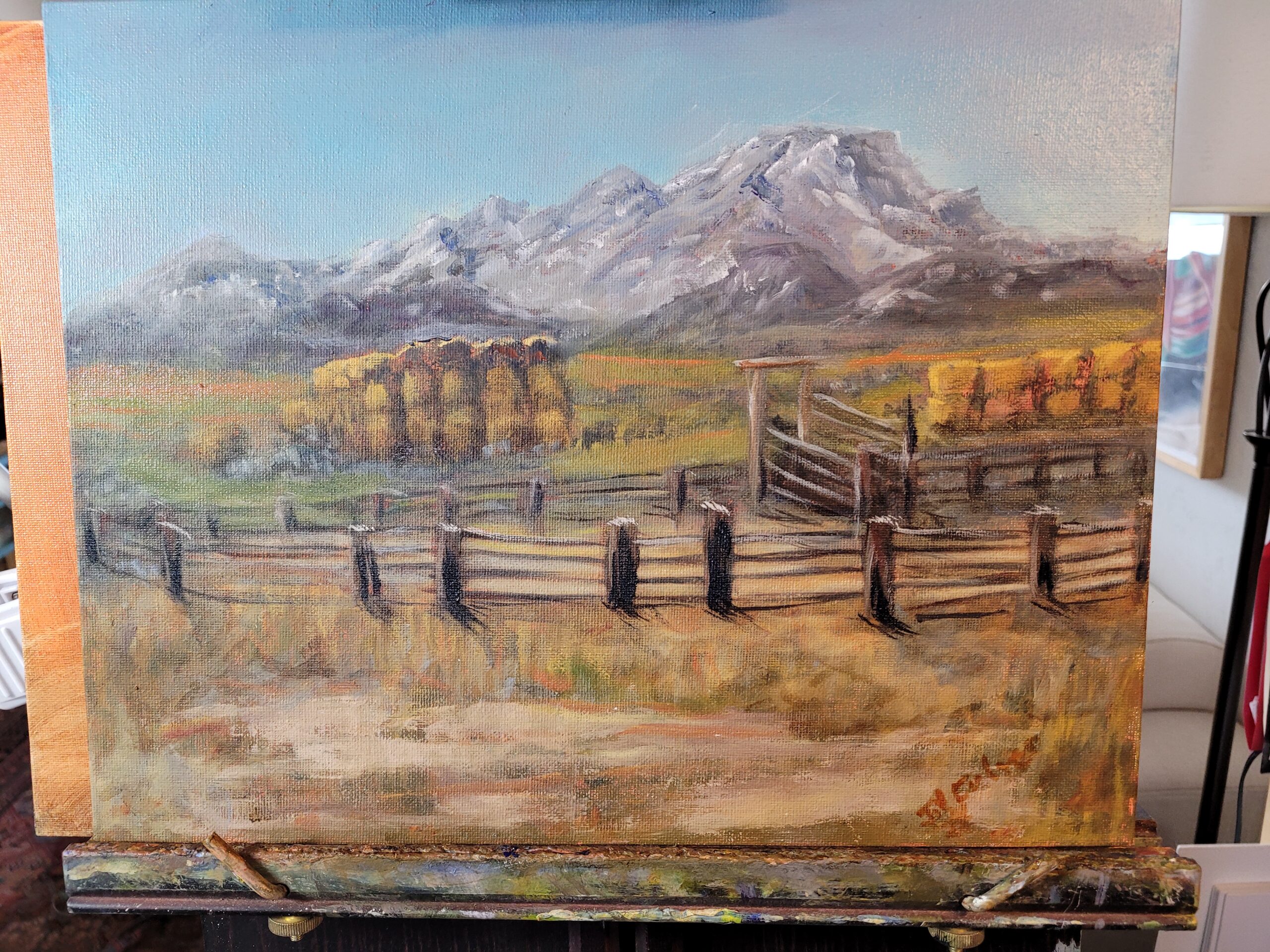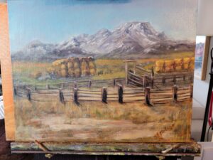 Ranch in The Rockies by Jil Culver, Artist, oil on 14″x11″ canvas board, 2024.